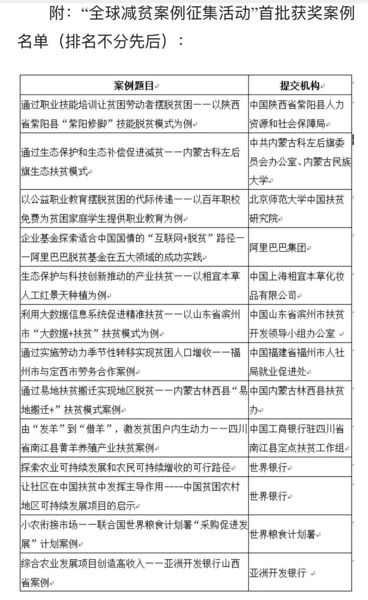全球減貧案例征集活動(dòng)自2018年5月正式啟動(dòng),該活動(dòng)由世界銀行、聯(lián)合國(guó)糧農(nóng)組織、聯(lián)合國(guó)世界糧食計(jì)劃署、亞洲開發(fā)銀行、中國(guó)國(guó)際扶貧中心和中國(guó)互聯(lián)網(wǎng)新聞中心聯(lián)合發(fā)起,面向全球關(guān)心扶貧的組織和個(gè)人征集原創(chuàng)優(yōu)秀減貧案例,旨在以案例為載體,推廣分享國(guó)內(nèi)外減貧成功實(shí)踐。活動(dòng)期間收到來(lái)自中國(guó)等三十多個(gè)國(guó)家減貧案例820篇。