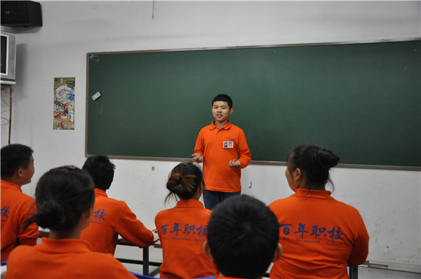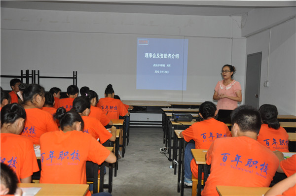 武漢百年職校出納及庫管劉芳老師為同學(xué)們做百年職校理事會(huì)及資助者介紹。劉芳老師告訴同學(xué)們要用感恩的心回報(bào)資助者和回報(bào)社會(huì)!