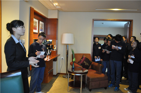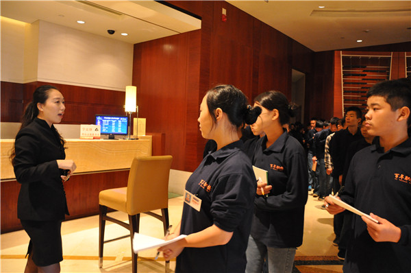 光明萬麗大酒店的培訓(xùn)經(jīng)理和大堂經(jīng)理為同學(xué)們介紹了酒店的背景、機(jī)構(gòu)設(shè)置和企業(yè)文化,隨后帶同學(xué)們參觀了整個(gè)酒店,包括餐廳、商務(wù)中心、康樂部、客房……同學(xué)們看著富麗堂皇的大酒店,連連發(fā)出感嘆,將來要是能在這樣的地方工作,該多好啊!