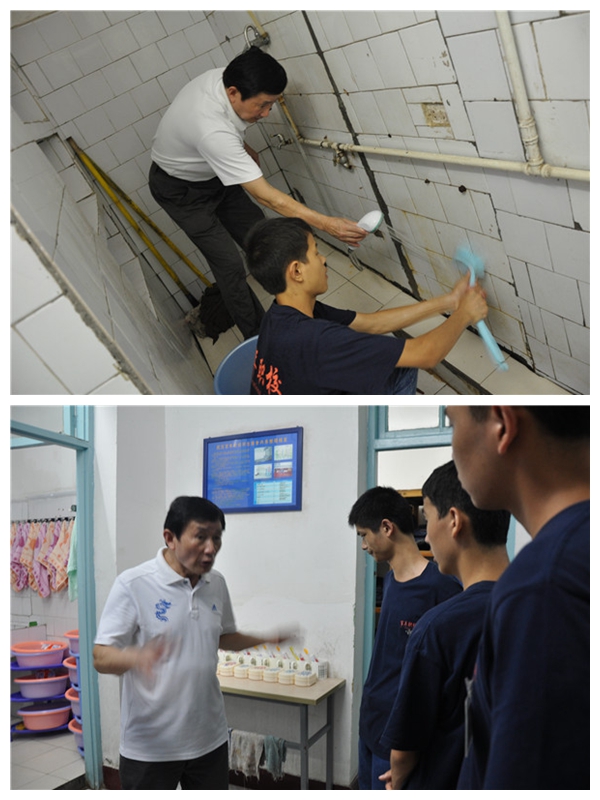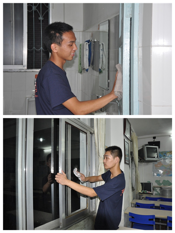 余校長、徐善杰老師和許琴老師帶領(lǐng)203宿舍的同學(xué)一起,將該宿舍打造成衛(wèi)生標(biāo)兵宿舍。余校長親自示范,同學(xué)們仔細(xì)觀摩,看完了,該動(dòng)手做了。小伙子們刷墻、擦門框、抹塵……那細(xì)致勁一點(diǎn)不輸女生!