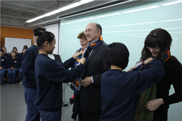 On the morning of November 4, 2013, four months after the former Ambassador Declan Kelleher, BNVS’ old friend, finished his term of office and said goodbye to BNVS students, BNVS staff and students were thrilled to see the familiar flag of Ireland again – the new Irish Ambassador, Paul Kavanagh (康寶樂) paid a visit to BNVS Beijing together with his wife, bringing their kind encouragement to our students, and thereby making this unique charity tradition continue.