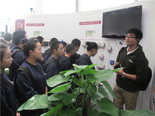施耐德公司員工首先向同學(xué)們介紹了施耐德的發(fā)展歷史,介紹了很多先進(jìn)的低壓電器產(chǎn)品; 包括了最受消費(fèi)者滿意歡迎的各式電器開關(guān),開闊了同學(xué)們的眼界,原來(lái)開關(guān)也可以多姿多彩!同時(shí)也了解到了施耐德在全國(guó)各地的影響力,在公司的展覽廳里擺放著一座小型的鳥巢模型,令施耐德驕傲自豪的是鳥巢全場(chǎng)的燈光以及各種電器設(shè)備都是由施耐德公司量身定做的。講解員向同學(xué)們介紹了智能樓宇用蘋果手機(jī)可以遠(yuǎn)程控制室內(nèi)的燈光及窗簾、并向大家做了演示。大約10分鐘后講解員把我們帶到了會(huì)議室,施耐德公司裴總向我們介紹了公司的發(fā)展歷程,和同學(xué)們交流并贈(zèng)送了禮品。