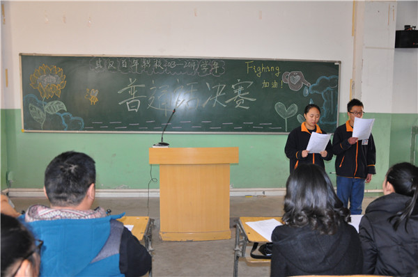 再來(lái)看看電工班的段展鵬,自從在預(yù)賽上“真人不露相”后,他更加認(rèn)真的準(zhǔn)備決賽了。每天早自習(xí)、中午、晚自習(xí)都在練習(xí),為了一個(gè)字的發(fā)音,不斷請(qǐng)教同學(xué),他不光是為了自己能夠在比賽中取得好的名次,更是想為電工班爭(zhēng)光。可惜由于太緊張,段展鵬同學(xué)發(fā)揮失常,不過,這次比賽也為他樹立信心!