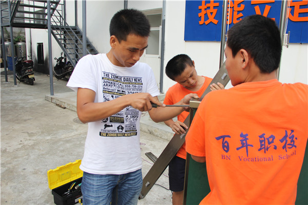 黑板運(yùn)到學(xué)校,又出現(xiàn)了新問(wèn)題:人家的黑板太長(zhǎng),我們的教室墻面太窄,不匹配,怎么辦?總務(wù)主任蘇老師拍拍工程班班主任杜云的肩膀:“杜工,這個(gè)難題恐怕要交給你了!”無(wú)所不能的杜工果然有辦法,他帶上幾個(gè)學(xué)生,量好墻面尺寸后,先用改錐把黑板的金屬鑲邊拆開(kāi),然后利索地用電鋸把黑板和鑲邊都鋸成相應(yīng)的尺寸,最后再按原樣把黑板組裝好。“升級(jí)改造”后的黑板嚴(yán)絲合縫,就跟新的一樣。