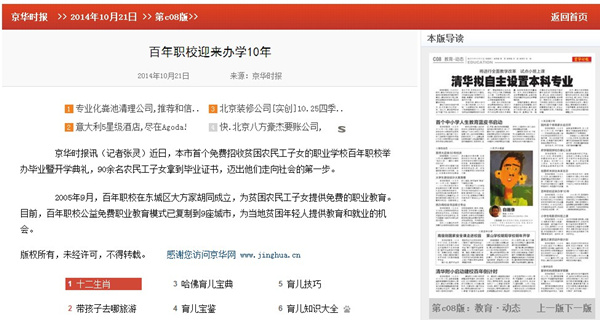 2005年9月,百年職校在東城區(qū)大方家胡同成立,為貧困農(nóng)民工子女提供免費的職業(yè)教育。目前,百年職校公益免費職業(yè)教育模式已復(fù)制到9座城市,為當(dāng)?shù)刎毨贻p人提供教育和就業(yè)的機會。