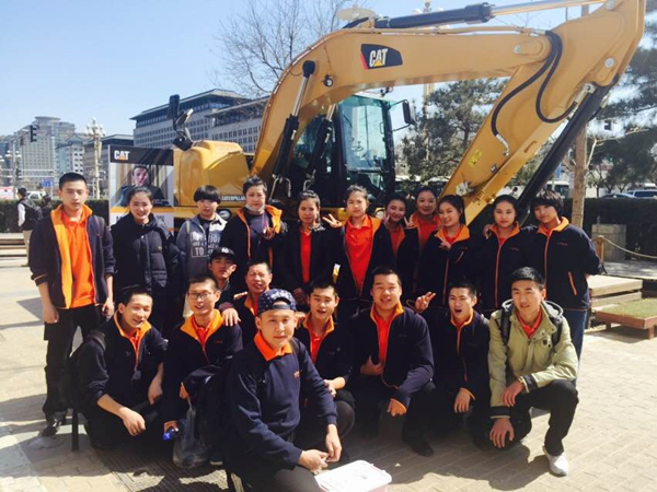 同學(xué)們和卡特彼勒挖掘機合影