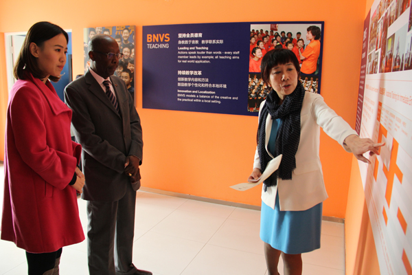 姚莉理事長帶領(lǐng)大使一行參觀校園,并介紹了學(xué)校情況,在愛心圖書館觀看了學(xué)校宣傳片。