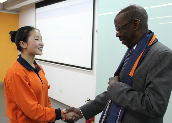 參觀完畢,大使一行來到愛心大講堂與學(xué)生互動交流。大使先生鼓勵在座的2015級學(xué)生們好好學(xué)習(xí),為國家變得更好而努力。接下來,大使先生用風(fēng)趣幽默的語言回答了學(xué)生們各種各樣的問題,比如安哥拉女性的傳統(tǒng)服飾是什么?安哥拉的教育與中國的教育有什么不同?大使先生最喜歡的中國食物是什么?為什么安哥拉的年輕人那么活潑?等等。學(xué)生代表向來訪嘉賓們贈送了絲巾表示感謝。