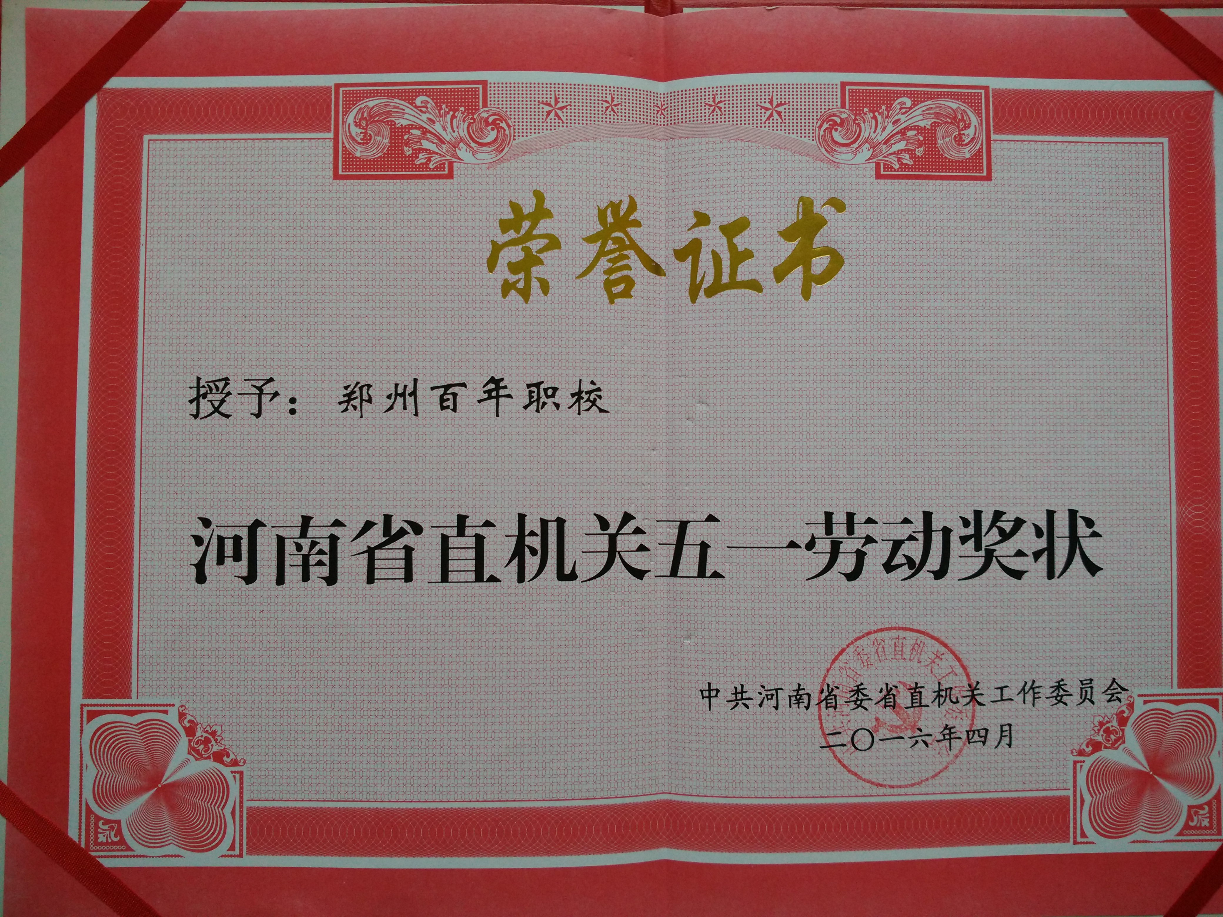 2016年,鄭州百年職校榮獲中共河南省委省直機(jī)關(guān)工作委員會授予的“河南省直機(jī)關(guān)五一勞動獎狀”。