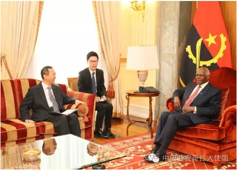 2016年4月25日,中國駐安哥拉大使崔愛民拜會安哥拉總統(tǒng)多斯桑托斯。