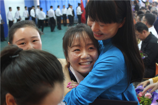 畢業(yè)生為教師獻花后與老師深情相擁