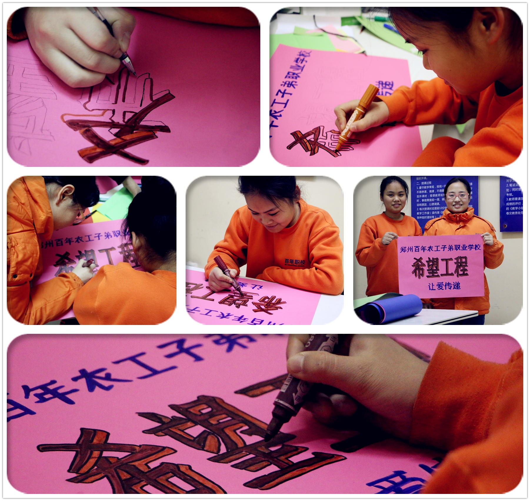 義賣前,同學(xué)們精心制作了宣傳海報(bào)。從文本構(gòu)思到色彩搭配,再到裝飾剪裁,每一個(gè)環(huán)節(jié)同學(xué)們都絞盡腦汁,目的是為了能夠?yàn)橄乱粚脤W(xué)弟學(xué)妹多籌集一些費(fèi)用,同時(shí)讓社會(huì)上更多的人了解這所全免費(fèi)的公益職業(yè)學(xué)校。