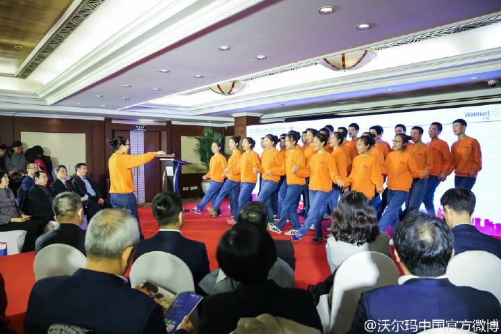 北京百年職校學(xué)生現(xiàn)場表演了民歌合唱《彌渡山歌》和情景短劇《大爺,您看行嗎?》,短劇根據(jù)沃爾瑪真實服務(wù)案例改編,講述一位身患糖尿病的老人在超市工作人員的幫助下最終買到自己需要的飲用水的故事,情感真摯,感動在場觀眾。