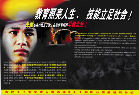 百年職校剛開辦,好多家長覺得“全免費(fèi)教育”是不是騙人啊。我家天歌高中畢業(yè)正放暑假,我想讓她幫我做點(diǎn)招生宣傳正好也接觸社會(huì)。那天,農(nóng)工子弟學(xué)校的老師帶著天歌、剛?cè)雽W(xué)的謝過等幾個(gè)學(xué)生,上外來務(wù)工人員多的市場發(fā)招生宣傳冊。下午,農(nóng)工子弟學(xué)校老師來電話說:“市場管理人員把孩子們都抓走了,說是發(fā)小廣告、發(fā)推銷傳單,我害怕先跑了,你們快去救他們吧!”當(dāng)時(shí)北京學(xué)校的校長是清華大學(xué)的王作垣教授,他急壞了,陪我奔城管所就去了。到那兒一看,天歌還挺鎮(zhèn)靜的,還一個(gè)勁兒解釋,維護(hù)謝過他們幾個(gè)人。但謝過他們都被嚇得夠嗆,乖乖地在罰抄50遍管理?xiàng)l例。王校長和我鞠躬作揖地道歉、解釋我們是做公益學(xué)校的招生宣傳。