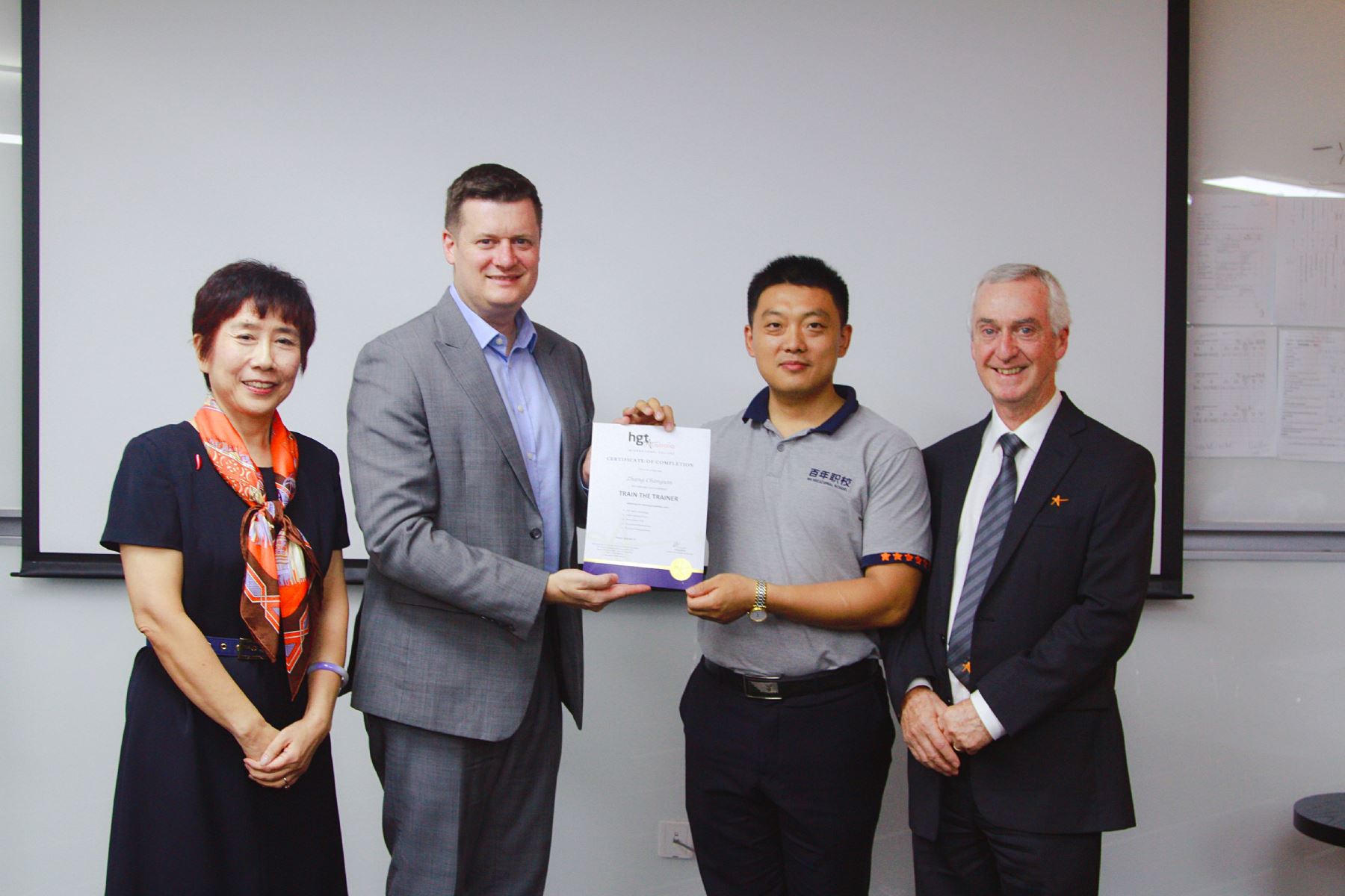 7月2日至7月27日,百年職校聯(lián)合澳大利亞HGT國際學(xué)院組織的澳大利亞國家職業(yè)教育培訓(xùn)與評估四級證書(TAE40110 Certificate IV in Training and Assessment,簡稱TAE)培訓(xùn)在北京百年職校順利舉行。27日下午,經(jīng)過四周全英文環(huán)境的高強(qiáng)度學(xué)習(xí),來自百年職校國內(nèi)8所學(xué)校的10位教師全部通過考試,獲得澳大利亞職業(yè)教育“培訓(xùn)與評估四級證書”。澳大利亞使館商務(wù)處公使銜參贊、澳大利亞貿(mào)易投資委員會高級商務(wù)專員Dan Tebbutt出席結(jié)業(yè)典禮,并為獲得資質(zhì)的學(xué)員頒發(fā)資格證書。