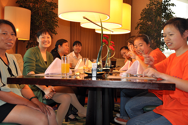 上午十點(diǎn)一刻,酒店派專車到學(xué)校把我們10對母子接到酒店,首先酒店工作人員帶領(lǐng)我們參觀了酒店主要的設(shè)施設(shè)備,如大堂吧、行政樓、健身房、游泳池等,最后我們一行人來到了咖啡廳,這是我們將要午餐的地方。