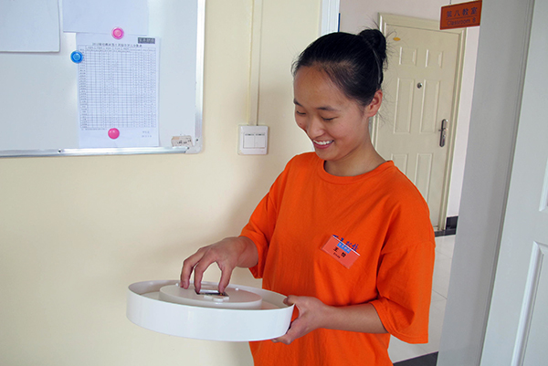 生活老師在對(duì)環(huán)境部新成員做檢查衛(wèi)生的培訓(xùn)