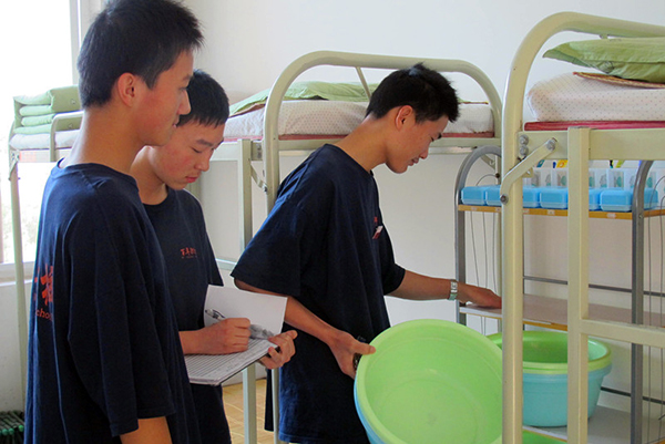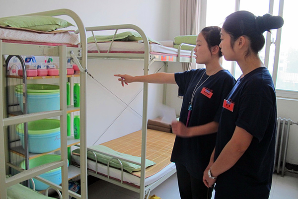 宿管部學(xué)生干部在檢查內(nèi)務(wù)