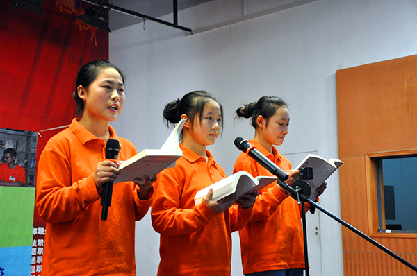 艾青說(shuō):“我愛(ài)這悲哀的國(guó)土,它的廣大而瘦瘠的土地,帶給我們以淳樸的言語(yǔ)與寬闊的姿態(tài)。” 服務(wù)二班的三位女生正在朗誦詩(shī)歌《北方》。