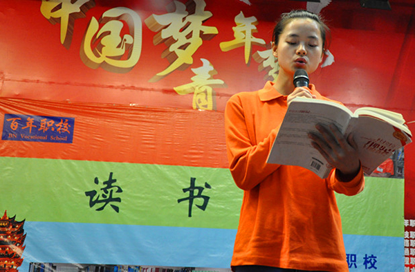2013年5月17日上午,團(tuán)校三樓報(bào)告廳里人聲鼎沸,朗朗的讀書(shū)聲回蕩在報(bào)告廳的上空。我校全體師生及中南財(cái)經(jīng)政法大學(xué)金融學(xué)院20名志愿者共110多人聚集在此舉行讀書(shū)會(huì)活動(dòng)。共有44名學(xué)生分別完成 “文學(xué)欣賞”、“詩(shī)歌鑒賞”、“讀書(shū)心得”和“薦書(shū)為友”四個(gè)階段。本次讀書(shū)會(huì)受到同學(xué)們的廣泛參與,總共有62人上臺(tái)讀書(shū)、薦書(shū)、朗誦或技能表演,學(xué)生參與率為80﹪。整個(gè)讀書(shū)會(huì)非常成功,特別值得一提的是平時(shí)膽小、羞怯的幾位同學(xué),如鄭米谷、陳靜等,在臺(tái)上誦讀文學(xué)作品時(shí),聲音洪亮,朗讀流利,儀態(tài)大方,得到了師生的鼓勵(lì)和贊揚(yáng)。鄭米谷同學(xué)興奮地說(shuō):“這次活動(dòng)也是對(duì)自己的一次很好的鍛煉,以后我再也不怕上臺(tái)了!”