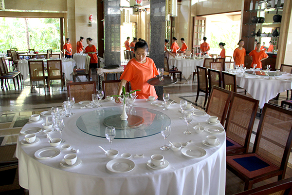 記起在第一次中餐擺臺時,我剛?cè)サ臅r候個人感覺什么都不會,就只好乖乖的聽豐老師細(xì)心的教我們,看老師說的很簡單,等到我動手的時候難啊!其中我剛開始的就是最怕端紅酒杯,當(dāng)我一手拿起托盤候,看那紅酒杯呀晃個不停,可把我嚇?biāo)懒恕?br />