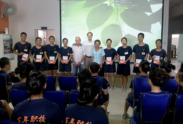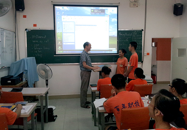 課程結(jié)束之際,即將返回美國(guó)的Anna老師(美籍華人)還特意購(gòu)買了英文學(xué)習(xí)圖書贈(zèng)送給同學(xué)們,勉勵(lì)即將走上實(shí)習(xí)崗位的學(xué)生繼續(xù)學(xué)習(xí)英語,同學(xué)們也將一個(gè)印有“百年職校”Logo的書包回贈(zèng)給Anna老師留念,并深情合唱一曲《相信愛》為敬愛的老師送行。