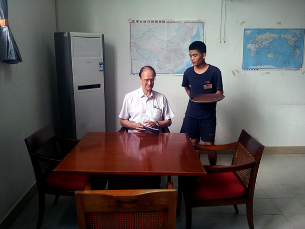 和外教老師進(jìn)行前臺(tái)英語和餐廳英語角色表演