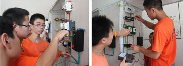 上圖為2013年6月25日上午,電工班同學(xué)進(jìn)行電力系統(tǒng)運(yùn)行與維修實(shí)操課現(xiàn)場。