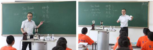 上圖為2013年6月25日上午,江挺老師為服務(wù)班同學(xué)介紹咖啡機(jī)的使用,以及咖啡這一西方主流飲品的歷史與文化。
