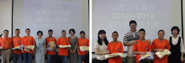 2013年6月29日上午,成都百年職校舉行了2013年度期末表彰總結(jié)會。獲獎同學(xué)除獲得獎狀外,還領(lǐng)取到學(xué)校精心準(zhǔn)備的實(shí)用獎品,包括絨毯、床上三件套、暖寶寶、保溫杯等。圖為頒獎現(xiàn)場。
