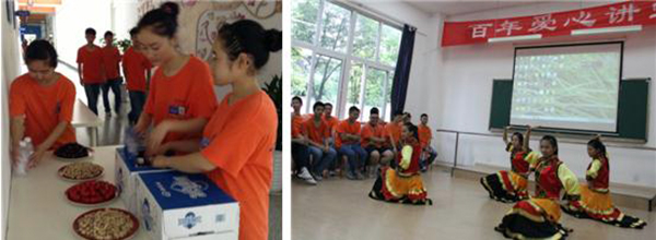 左圖為服務(wù)班同學(xué)為聯(lián)歡會提供會場服務(wù)。右圖為幼教班同學(xué)為大家?guī)砭实奈璧浮?/p>