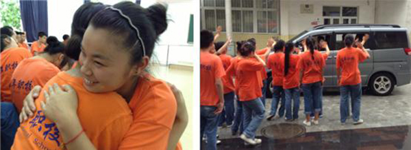 左圖為同學(xué)們神情擁抱。右圖為同學(xué)們依依不舍地送別比自己先行一步參加實(shí)習(xí)的同學(xué)。