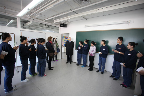 On the morning of November 4, 2013, four months after the former Ambassador Declan Kelleher, BNVS’ old friend, finished his term of office and said goodbye to BNVS students, BNVS staff and students were thrilled to see the familiar flag of Ireland again – the new Irish Ambassador, Paul Kavanagh (康寶樂) paid a visit to BNVS Beijing together with his wife, bringing their kind encouragement to our students, and thereby making this unique charity tradition continue.