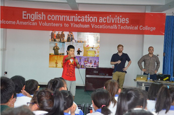 2014年6月,百年職校長期志愿者朱方剛與來自美國的Noah、Charles利用假期為學(xué)校提供志愿服務(wù),三人先在銀川學(xué)校與學(xué)生同吃同住開展為期10天的英語教學(xué)活動,后在北京學(xué)校承擔(dān)大量的翻譯工作。