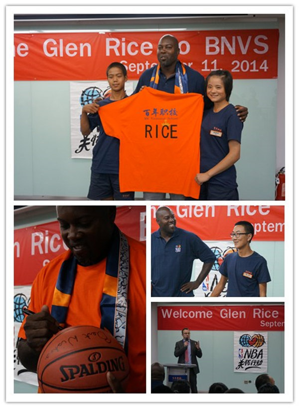 2014年9月11日下午, 美國大使館文化處一行及NBA球星格倫·萊斯(Glen Rice)到訪北京百年職校,參觀校園并了解百年職校的辦學(xué)模式和教育理念。