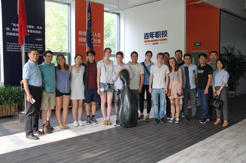2018年5月16日,在百年職校長(zhǎng)期資助方高翎基金會(huì)的引薦下,耶魯大學(xué)Low strung大提琴樂團(tuán)來到百年職校參觀,百年學(xué)生宣講團(tuán)向耶魯大學(xué)的同學(xué)們對(duì)學(xué)校進(jìn)行了詳細(xì)地介紹。